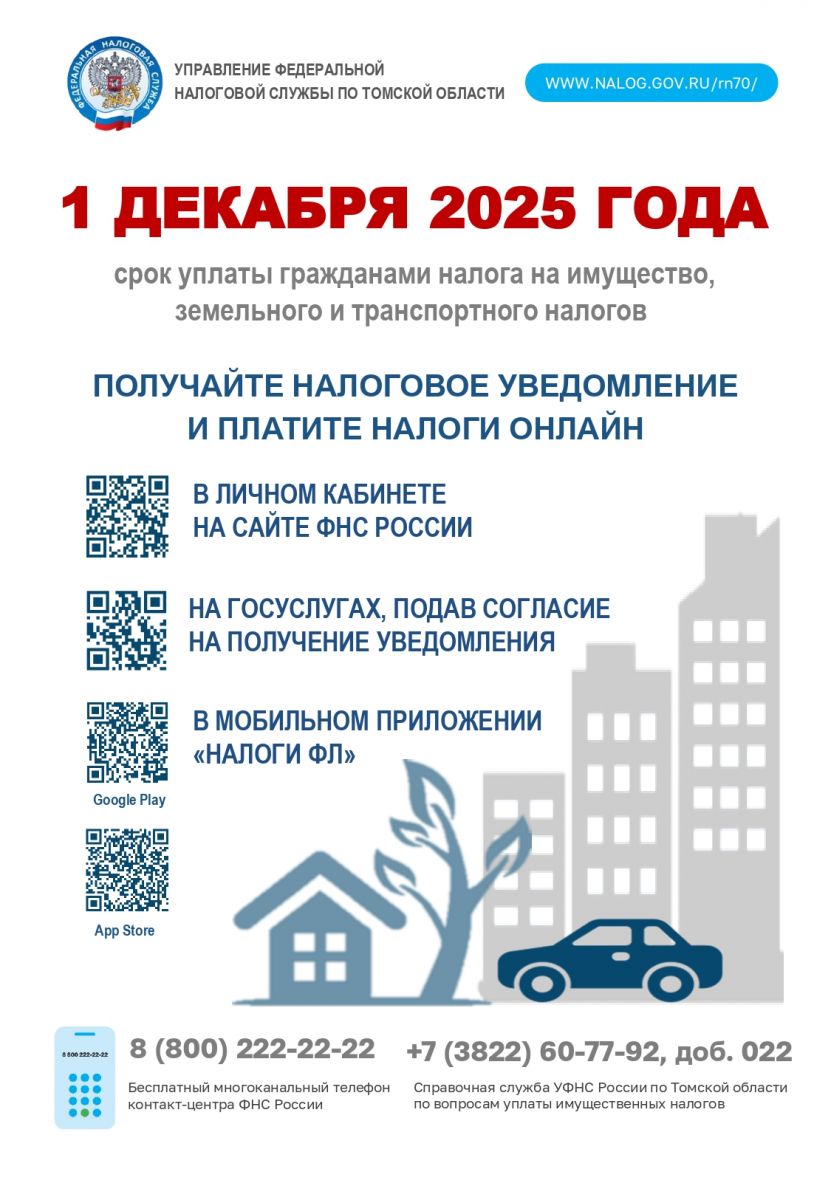 Управление Федеральной налоговой службы по Томской области сообщает о начале массовой рассылки налоговых уведомлений на уплату имущественных налогов физическими лицами за 2024 год. Крайний срок уплаты — 1 декабря 2025 года.